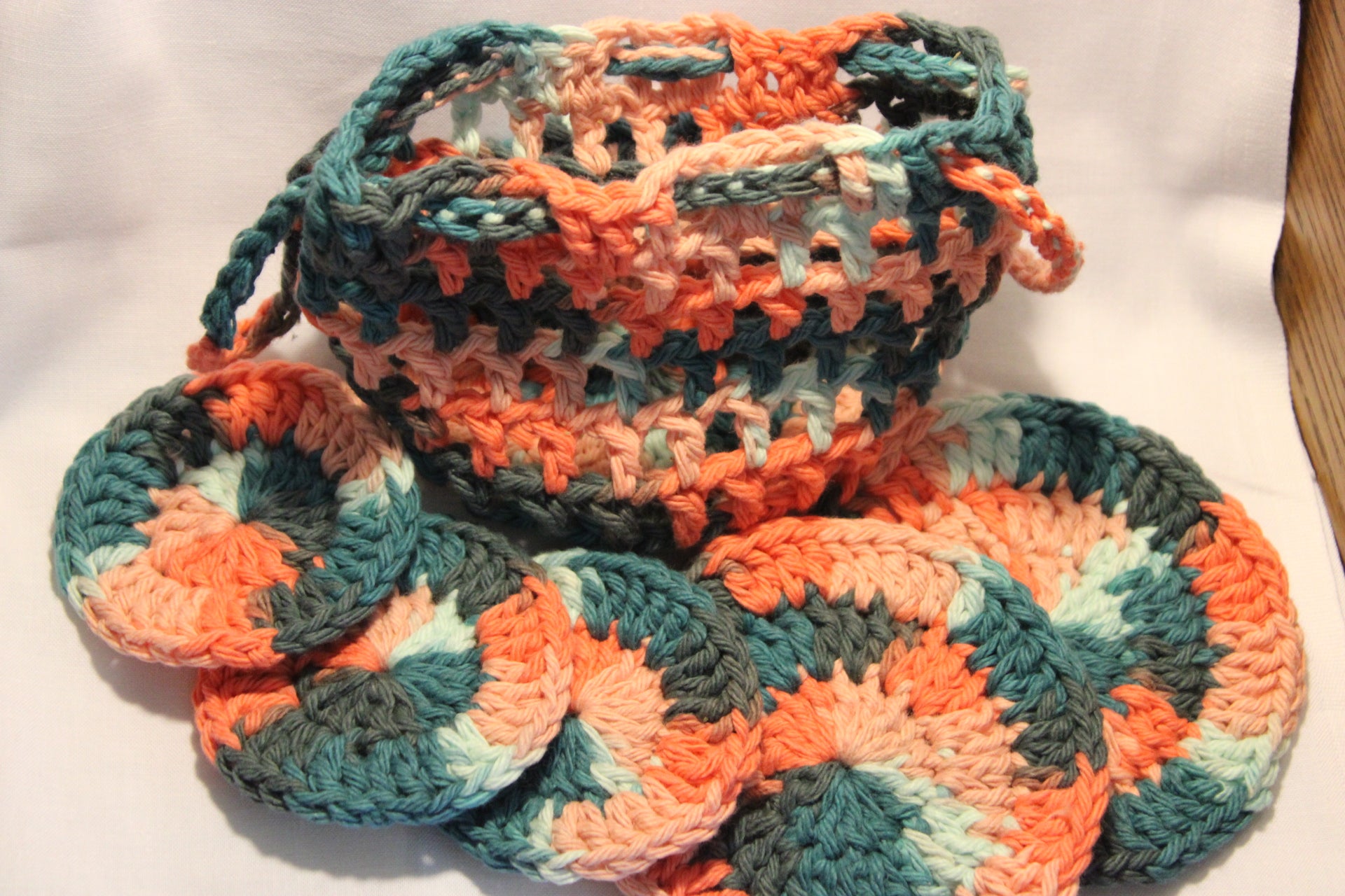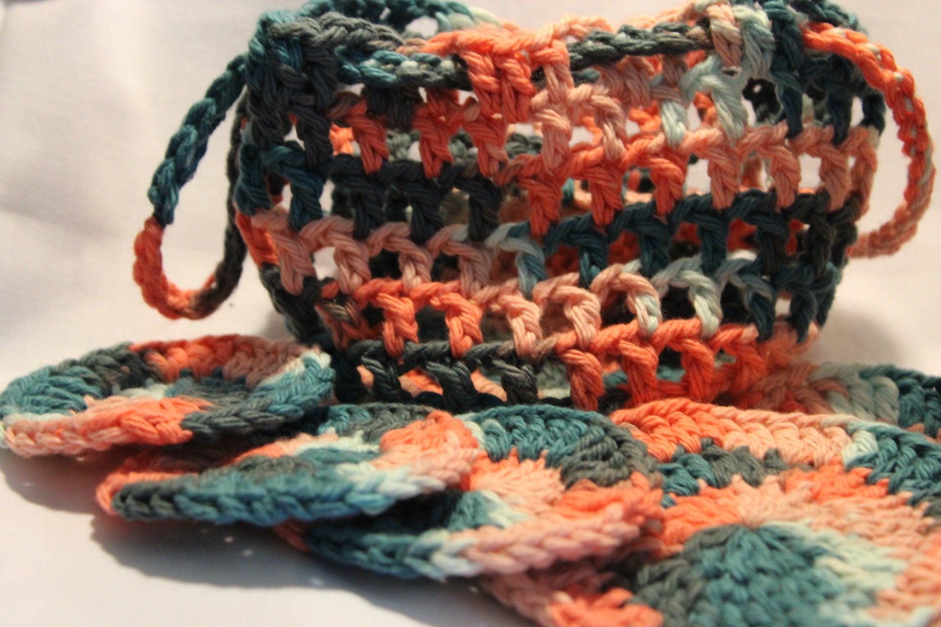 This luxurious set comes with two large cotton pads and three small pads which can be used for dishes, make up removal, showering and even coasters! You the bag as a soap holder and exfoliant for your shower and skin needs!