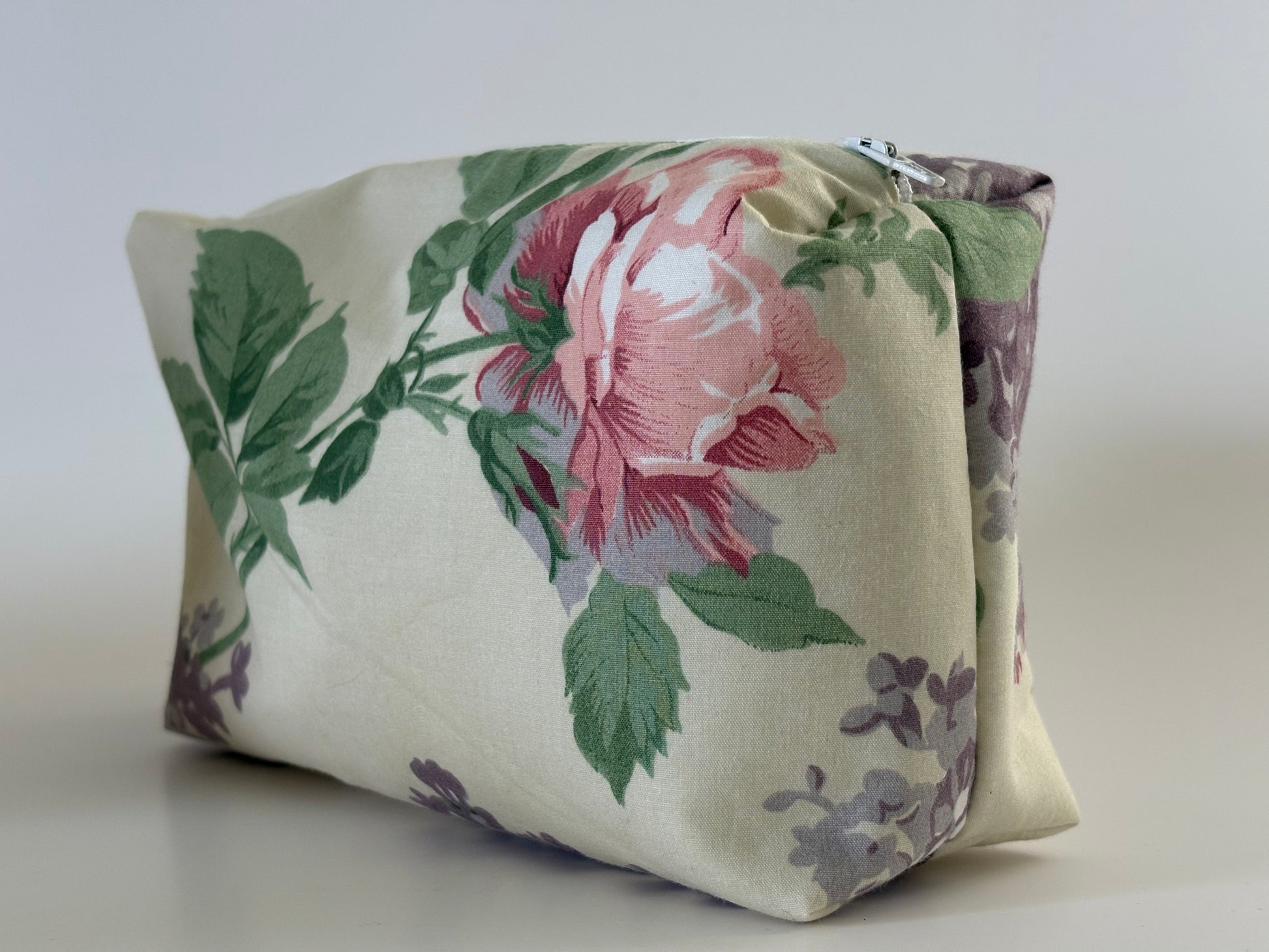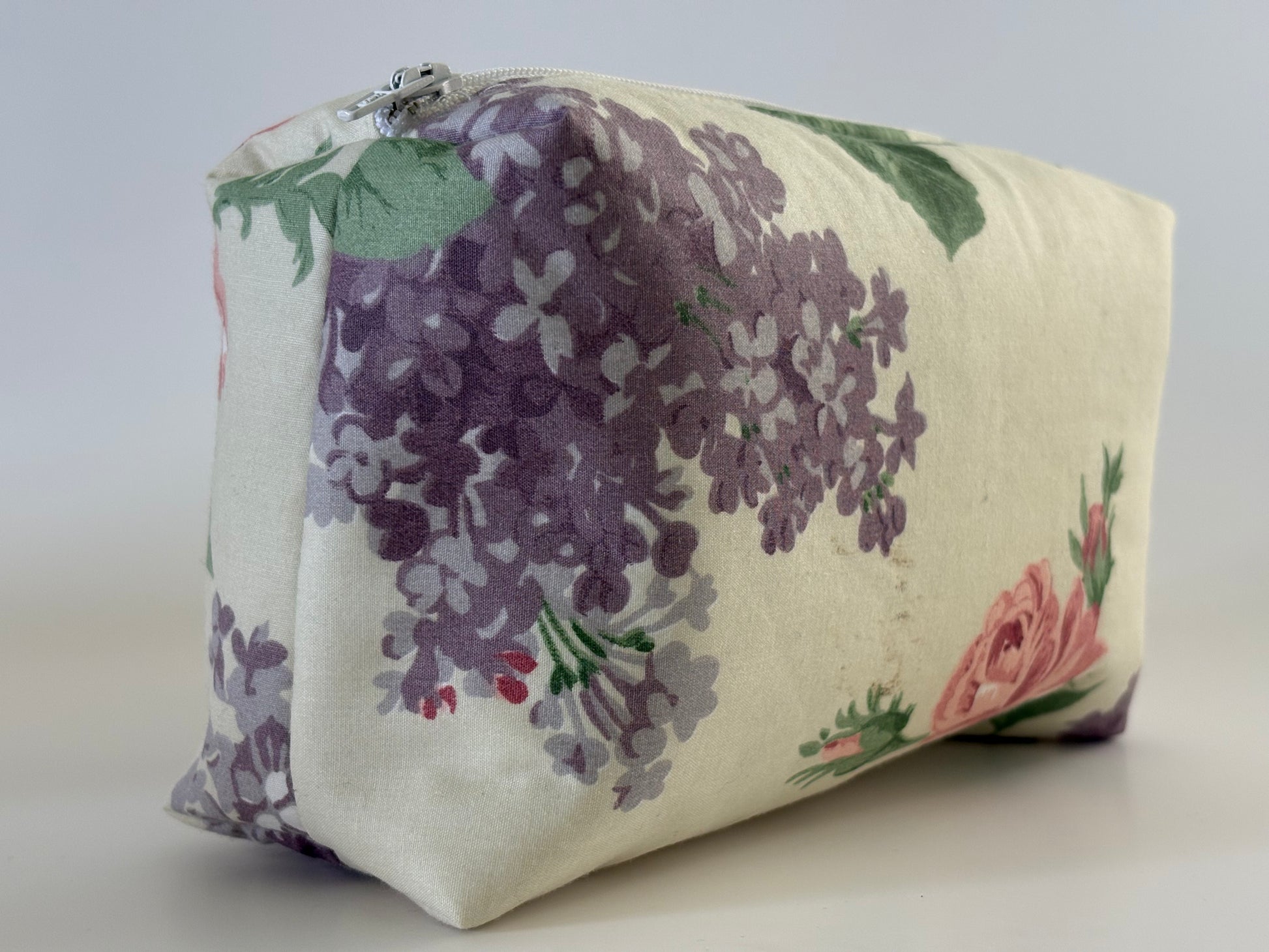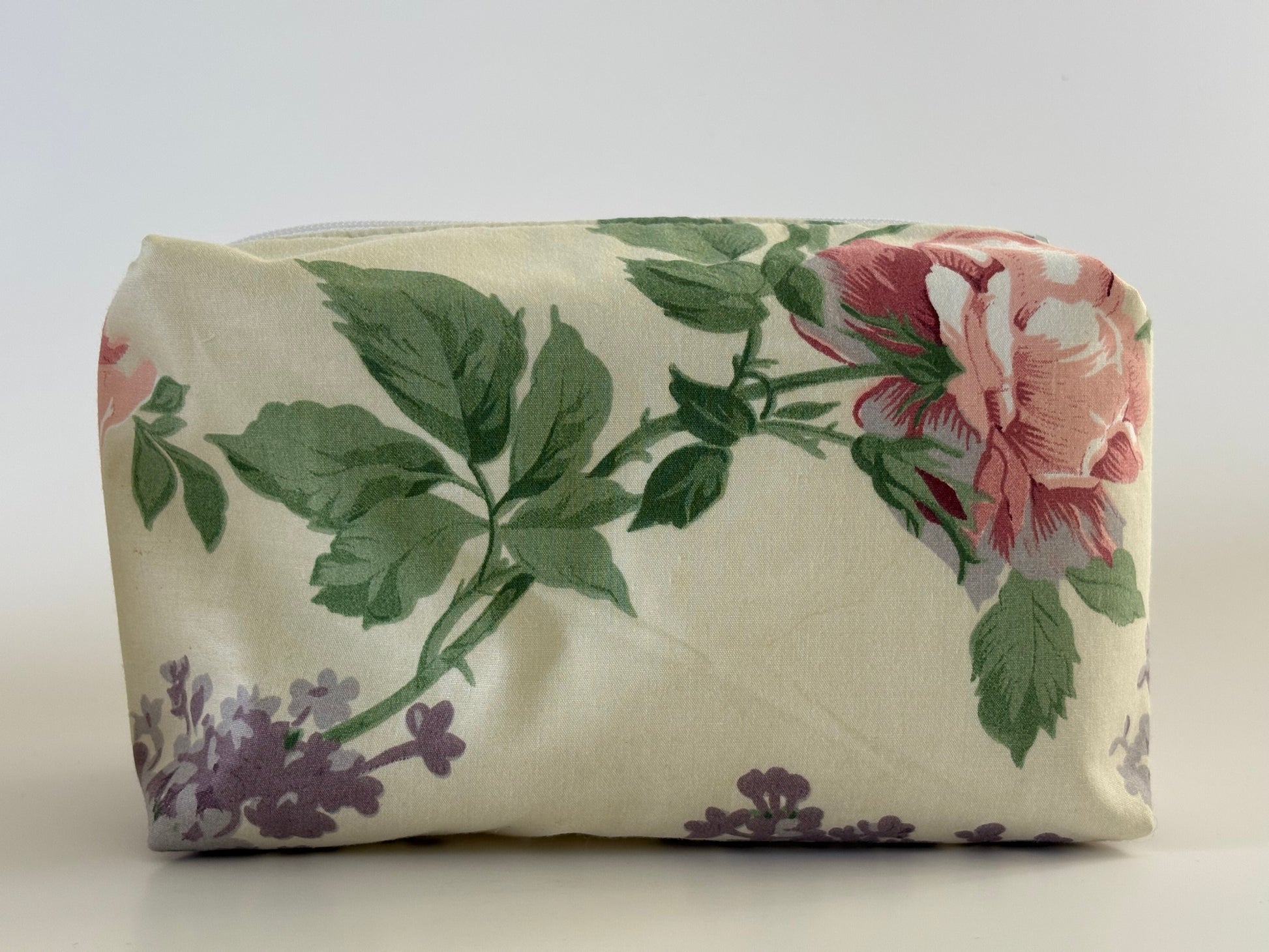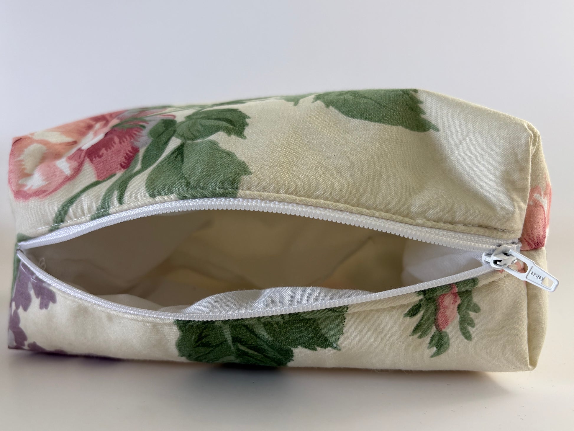 This pouch is made from donated materials with a soft but stiff outside and a cotton lined inside. Perfect for a pencil case, make-up bag, or even small tools!
